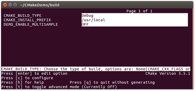When prompted to run CMake, make sure to define the CMAKE_BUILD_TYPE variable since the Makefile generator is single-configuration. You can also specify project-specific variables here, such as CMakeDemo’s DEMO_ENABLE_MULTISAMPLE option.