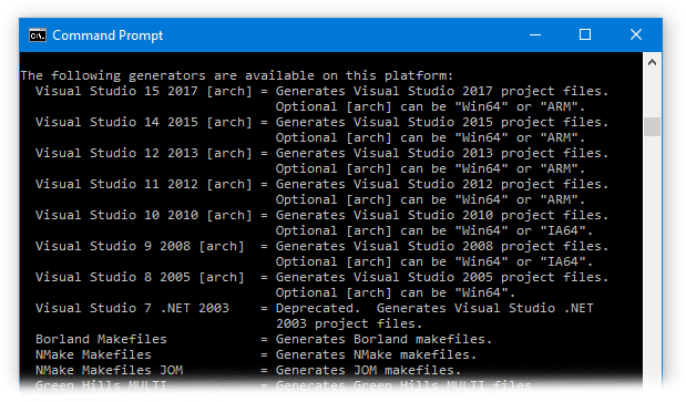 We’ll generate a Visual Studio .sln file from the CMake command line. If you have several versions of Visual Studio installed, you’ll want to tell cmake which version to use. Again, assuming that the source folder is the parent:
