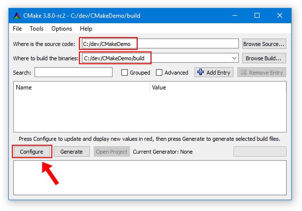 After the initial configure step, the GUI will show you a list of cache variables, similar to the list you see when you run cmake -L -N . from the command line. New cache variables are highlighted in red. (In this case, that’s all of them.) If you click Configure again, the red highlights will disappear, since the variables are no longer considered new.