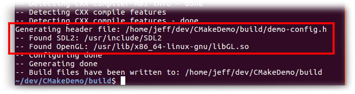 Additional things may happen during the configure step, depending on the contents of CMakeLists.txt. For example, in our sample CMakeDemo project, the configure step also: