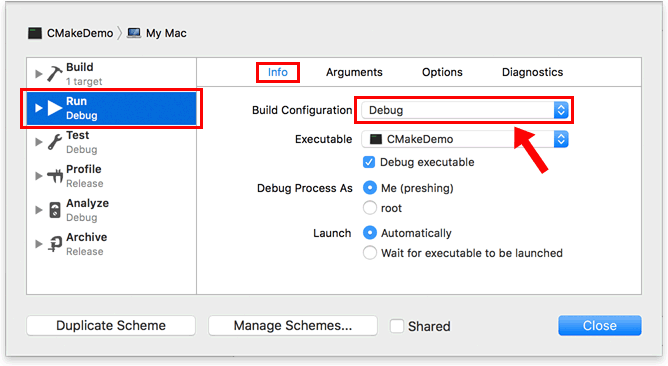 After that, click “Edit Scheme…” from the same drop-down list, then choose a build configuration under Run → Info. Again, I don’t recommend CMake’s default Release configuration, as the lack of debug information limits its usefulness.