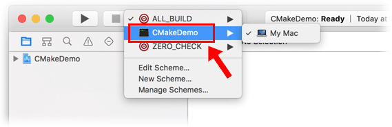 This will create an .xcodeproj folder. Open it in Xcode. (I tested in Xcode 8.3.1.) In the Xcode toolbar, click the “active scheme” drop-down list and select the target you want to run.